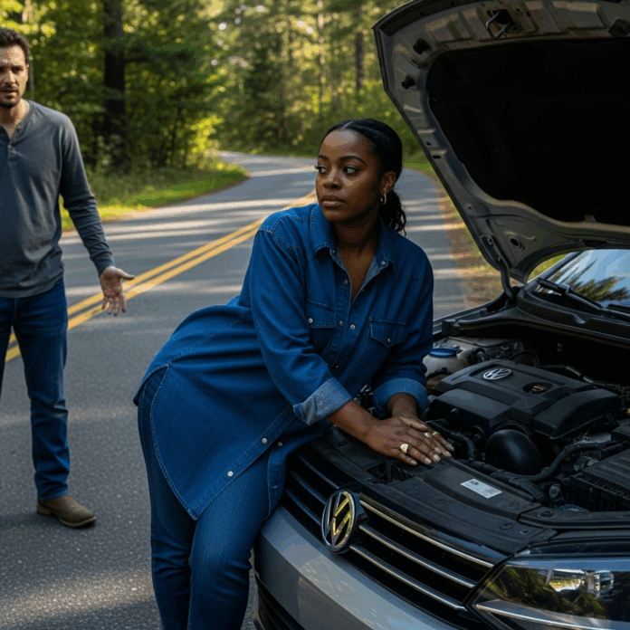 As he paced back and forth, kicking at the gravel on the side of the road, he heard the slow rumble of an older pickup truck pulling up behind him. It was a faded red Ford F-150, dented and dusty but steady. From the driver’s side, a Black woman in her mid-thirties stepped out. She wore a simple tank top, ripped jeans, and work boots. Her hair was tied up in a messy bun, and a streak of grease stained her cheek.