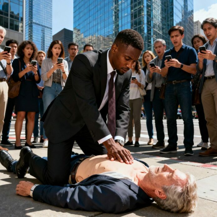 He was early, confident, and focused—until he saw the small crowd forming near the corner of Fifth Avenue. People were murmuring, frozen in place. Curiosity tugged at him, but his rational side screamed, You don’t have time.