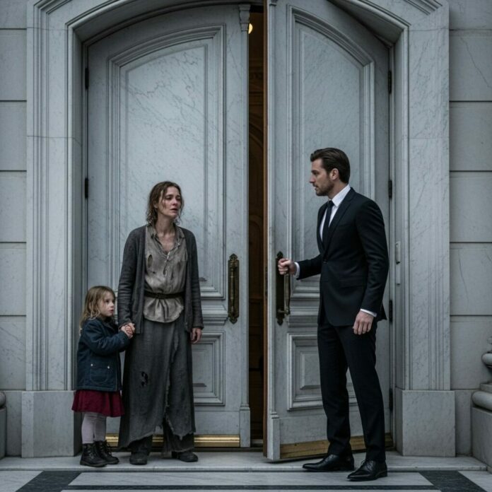 When he opened the door, he expected a delivery, maybe a staff member returning late. Instead, he saw a woman standing there, her clothes frayed, her cardigan dotted with tiny holes, and her arms trembling as she held a small child close to her chest. Her eyes, hollow yet stubbornly alive, carried the weight of battles no one else could see.