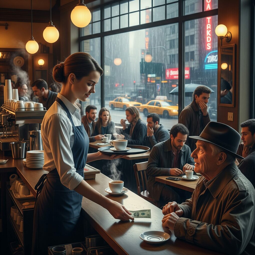 The bell above the door jingled sharply, drawing her attention. A man in his early fifties stepped inside, his threadbare coat dripping with rain, scuffed shoes leaving faint wet prints. His salt-and-pepper hair clung to his forehead, and his eyes carried a weariness that spoke of life’s hardships. Hesitant, he approached the counter and requested a simple black coffee. When he reached for his wallet, panic flashed across his face.