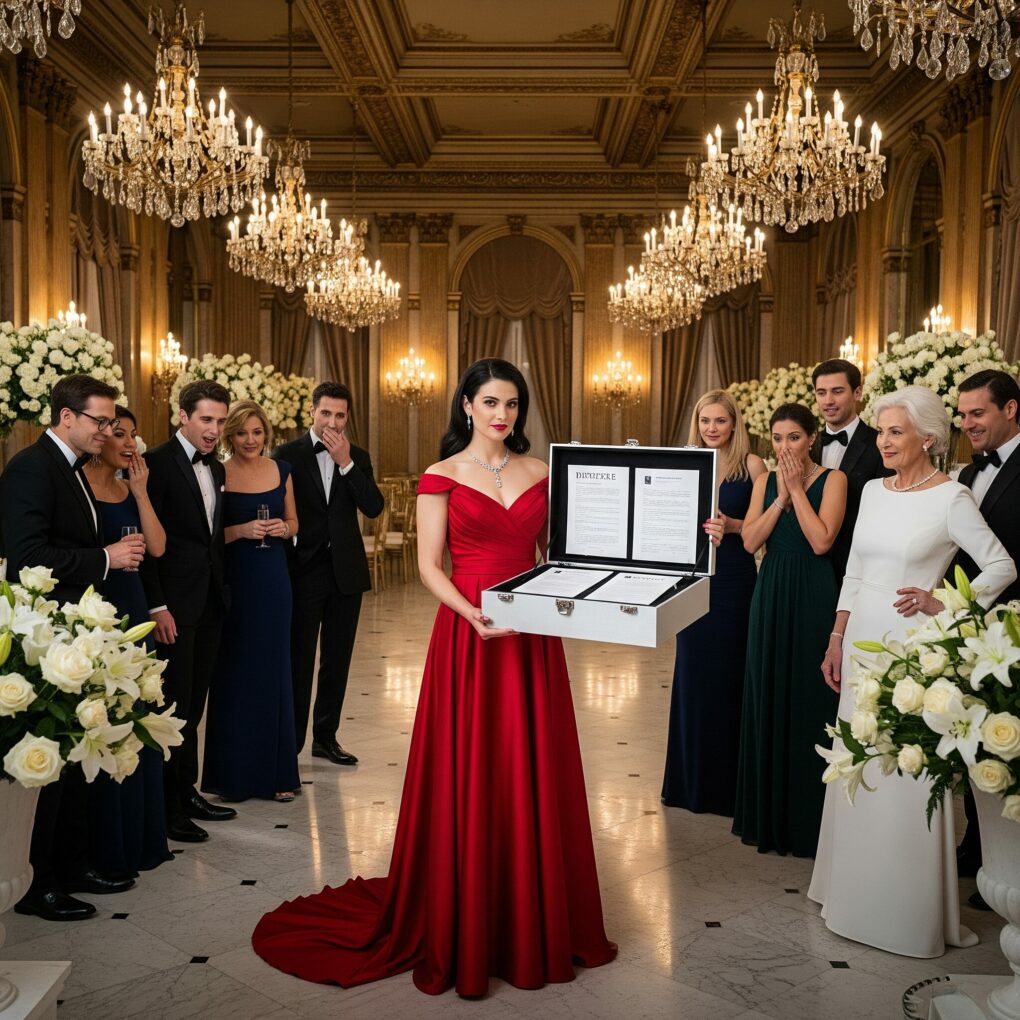 My name is Rachel Monroe, and exactly one year ago, everyone thought I made the worst mistake of my life when I married Ethan Caldwell. Tonight—standing in a chandelier-filled ballroom, wearing a crimson gown worth more than most people’s annual salary, holding divorce papers wrapped in a silver bow—I know the truth. Marrying Ethan wasn’t the mistake. Trusting his mother was.