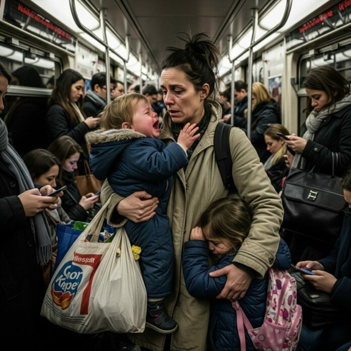 I never imagined I’d become one of those mothers struggling through rush hour on the subway, arms aching, patience fraying, surrounded by strangers pretending not to stare. But there I was. My name is Emily Carter, standing on a crowded Chicago train with two heavy grocery bags, my three-year-old son Noah crying inconsolably in my arms, and my five-year-old daughter Grace tugging at my jacket, asking why we couldn’t just drive like her friends’ moms.