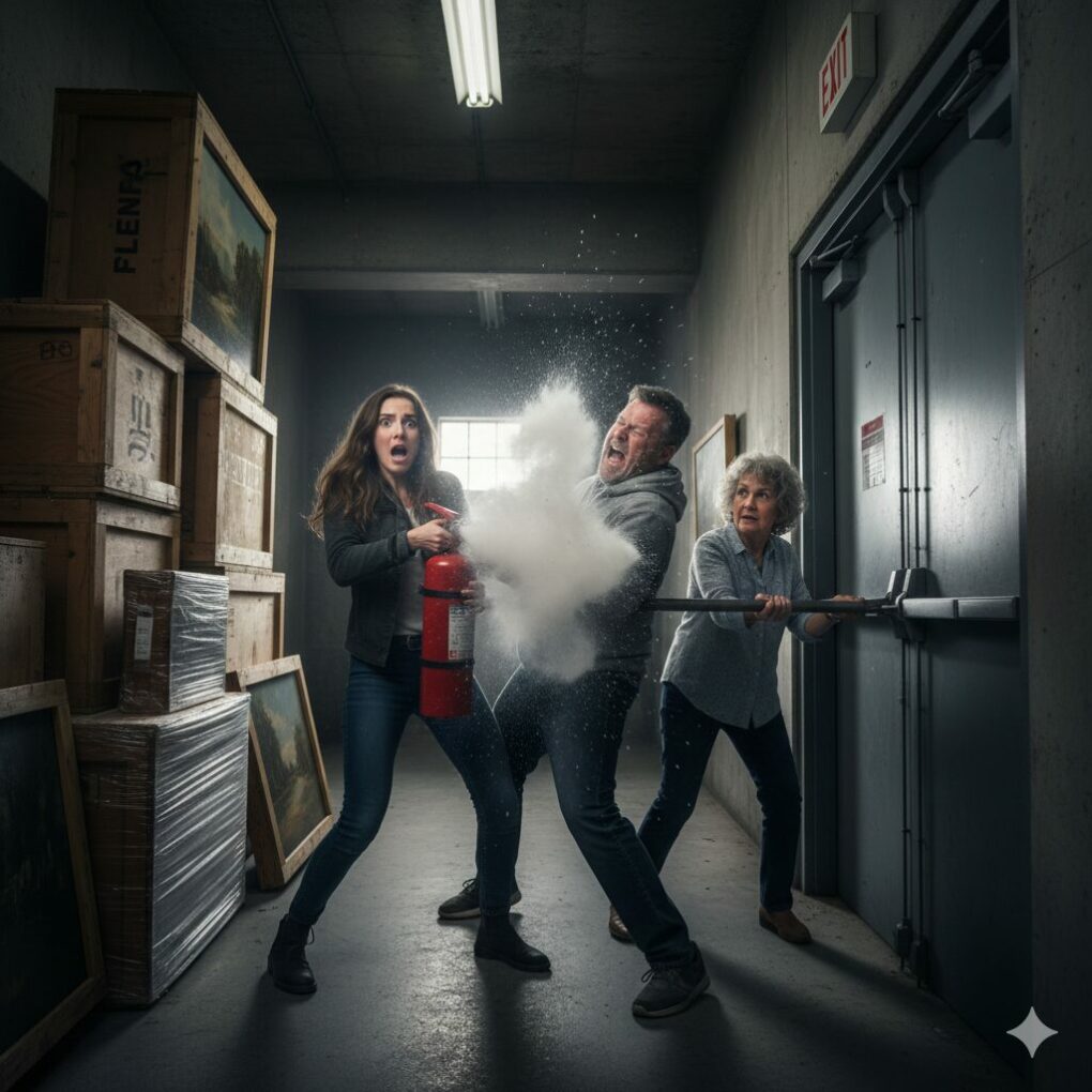 The freight elevator dinked, but I didn’t step inside. Instead, I pulled the pin on the extinguisher. As Marcus lunged forward, I squeezed the lever. A massive cloud of white chemical powder exploded into his face, blinding him instantly. He screamed, stumbling backward into a stack of wooden crates. Clara grabbed a heavy metal bar used for securing shipments and jammed it through the handles of the door we had just exited, effectively locking him in the narrow corridor.