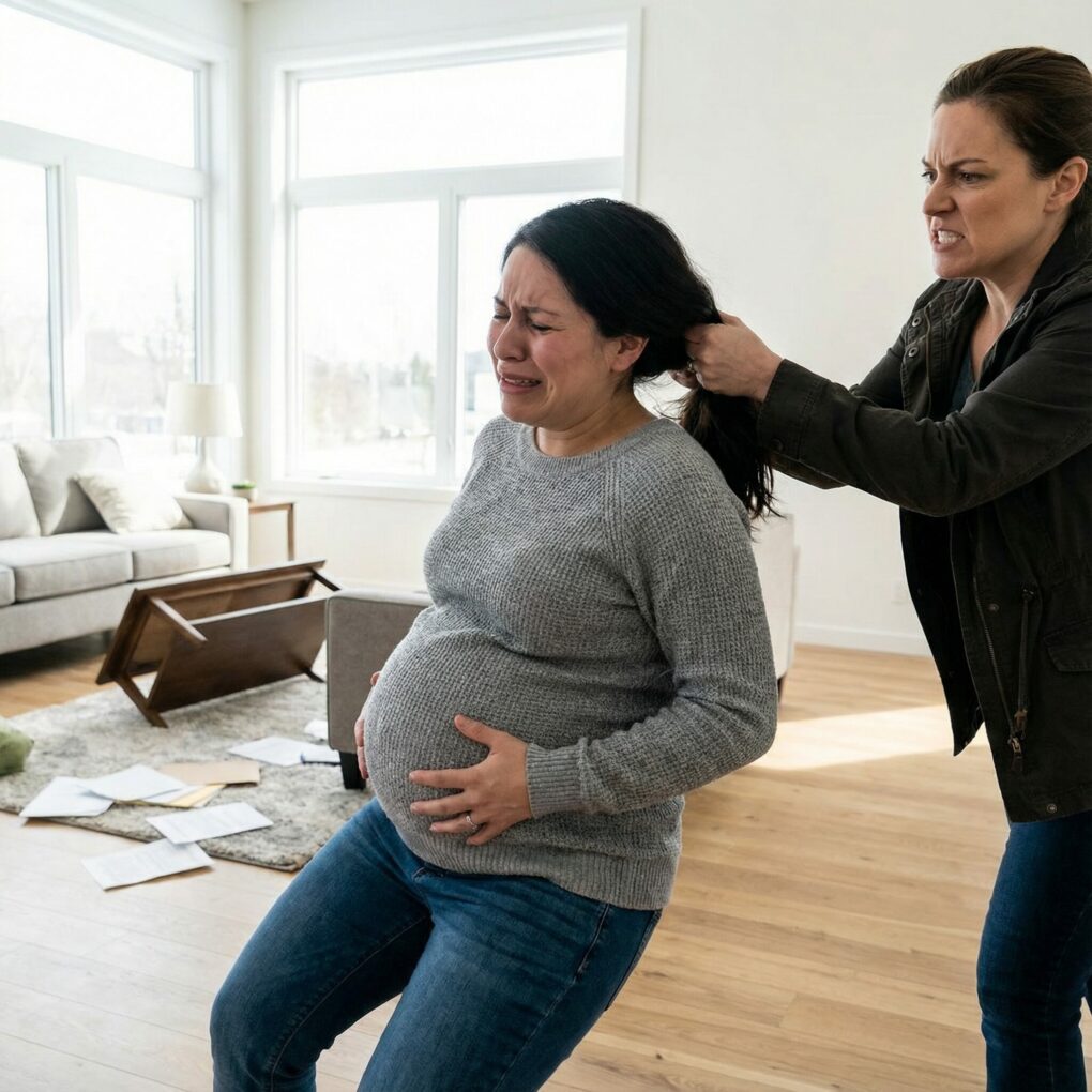 I stood up, one hand on my belly, and told her to leave. That was when she lost control. She stepped closer, shouting, and suddenly slammed her fist into my swollen stomach. A sharp pain ripped through me, and I felt a terrifying warmth as my water broke instantly. I screamed, begging her to stop, but she didn’t. She grabbed my hair, dragged me across the living room floor, and kept yelling about money and betrayal.