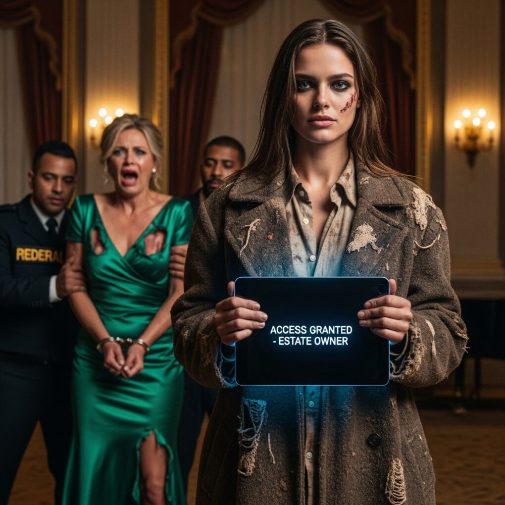 She laughed, a harsh, metallic sound. “This isn’t your father’s house anymore. It’s mine. Guards! Escort this trash to the kitchen. Maybe the staff has some leftovers for a beggar.” Two large men grabbed my arms, dragging me away as the crowd jeered. But as they pulled me toward the service hallway, I checked the hidden watch beneath my sleeve. The countdown was at zero. Suddenly, the massive crystal chandelier flickered and died. The emergency red lights kicked in, casting a blood-red glow over the room. I stood up straight, shaking off the guards’ grip with a strength that made them stumble back. I pulled a sleek, black encrypted tablet from the lining of my “ruined” coat. “The party is over, Evelyn,” I projected my voice, no longer trembling, but cold as ice. “Because I don’t just own this house—I just bought your life.”