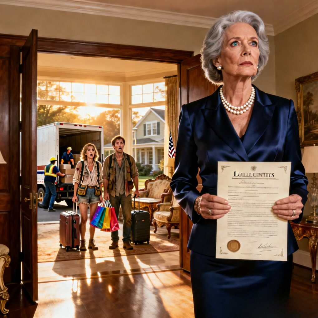On the day of their return, I heard their rental car pull into the driveway. They walked in, tan and boastful, expecting to find a starving old woman. Instead, the house was transformed. The smell of expensive sandalwood filled the air, and professional movers were carrying out the last of my vintage furniture. I stood in the center of the living room, wearing a tailored silk suit, holding a legal folder. David’s jaw dropped. “Mom? What is this? Who are these people?” he demanded. I looked him dead in the eye and handed him a court summons. “You’re late, David,” I said coldly. “And you’re also trespassing. I just bought the mortgage back from the bank, and your name isn’t on the new deed.”