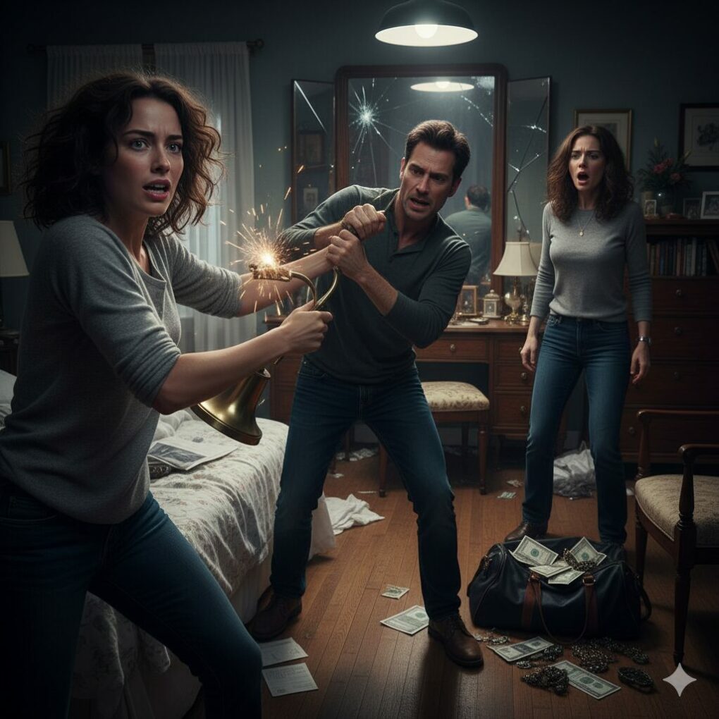 As Mark’s arms slid under my knees and back, I knew I had one shot. I didn’t wait for him to lift me. I snapped my eyes open and drove my palm upward with every ounce of adrenaline I had, catching him squarely under the chin. He roared in surprise, stumbling back into the vanity and shattering the mirror. Sarah screamed, dropping the duffel bag as stacks of my life’s work spilled across the floor. I didn’t stop to argue. I lunged for the heavy brass lamp on the nightstand and swung it with a primal fury. It connected with Mark’s shoulder just as he tried to lung for me, sending him crashing into the wall.