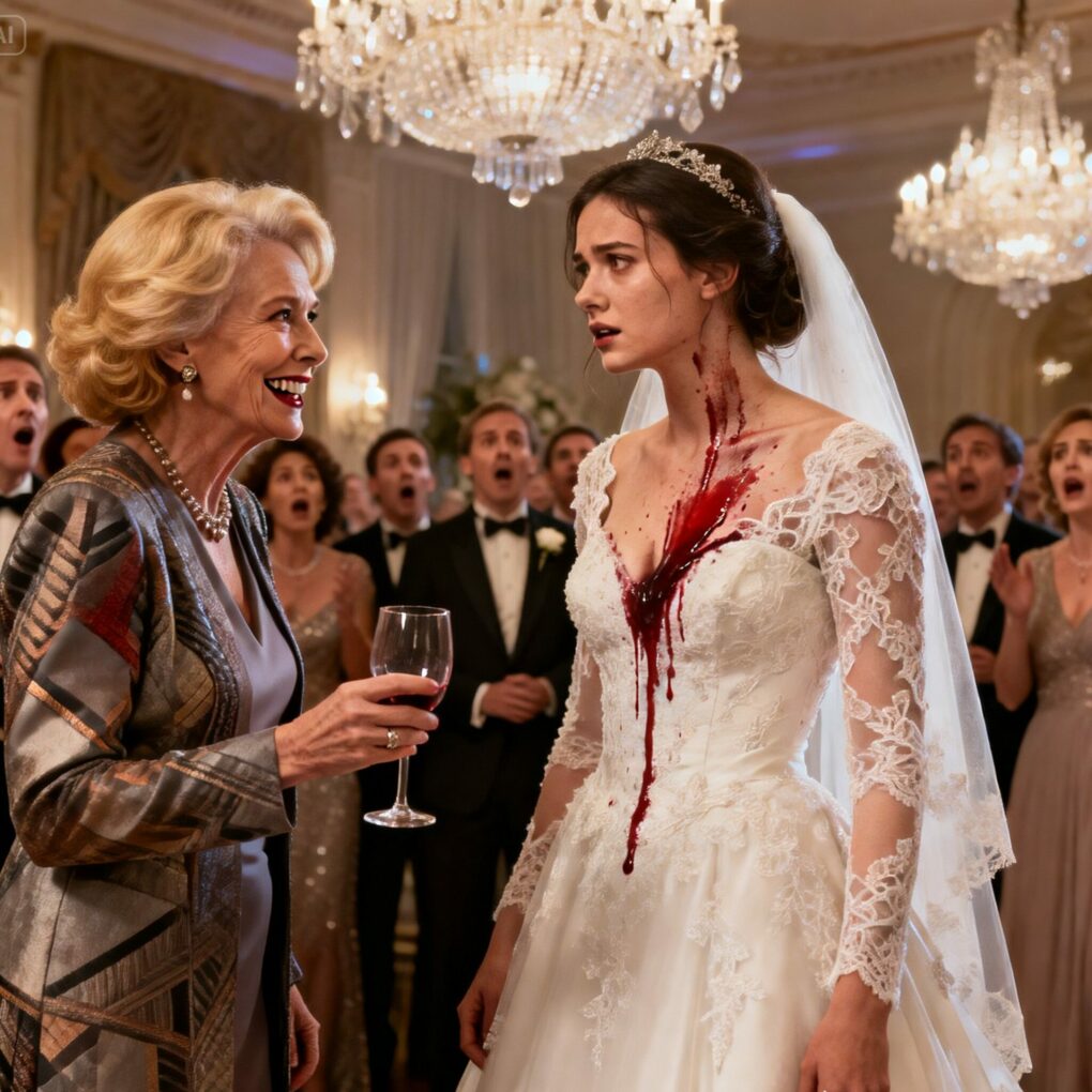 I watched red wine explode across the front of my white wedding dress, the liquid seeping into the lace like a spreading wound. The ballroom fell into a stunned, unnatural silence. At the center of it all stood Patricia Ashworth—elderly, impeccably dressed, blonde hair sculpted into perfection—holding an empty wine glass and wearing a smile that felt colder than ice.