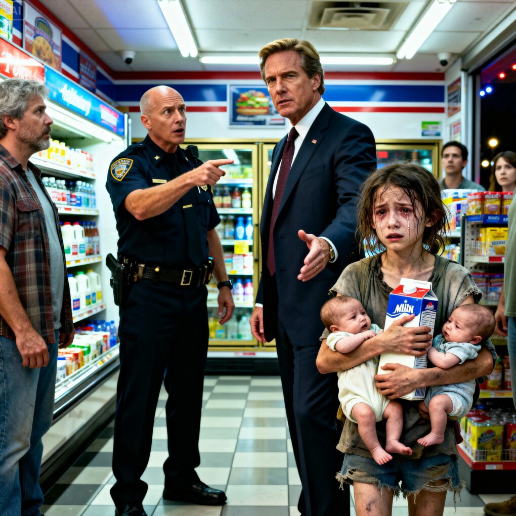 The little girl froze, clutching a small box of milk to her chest like it was something precious. She couldn’t have been more than eight years old. Her shoes were too big, her jacket too thin for the cold outside.