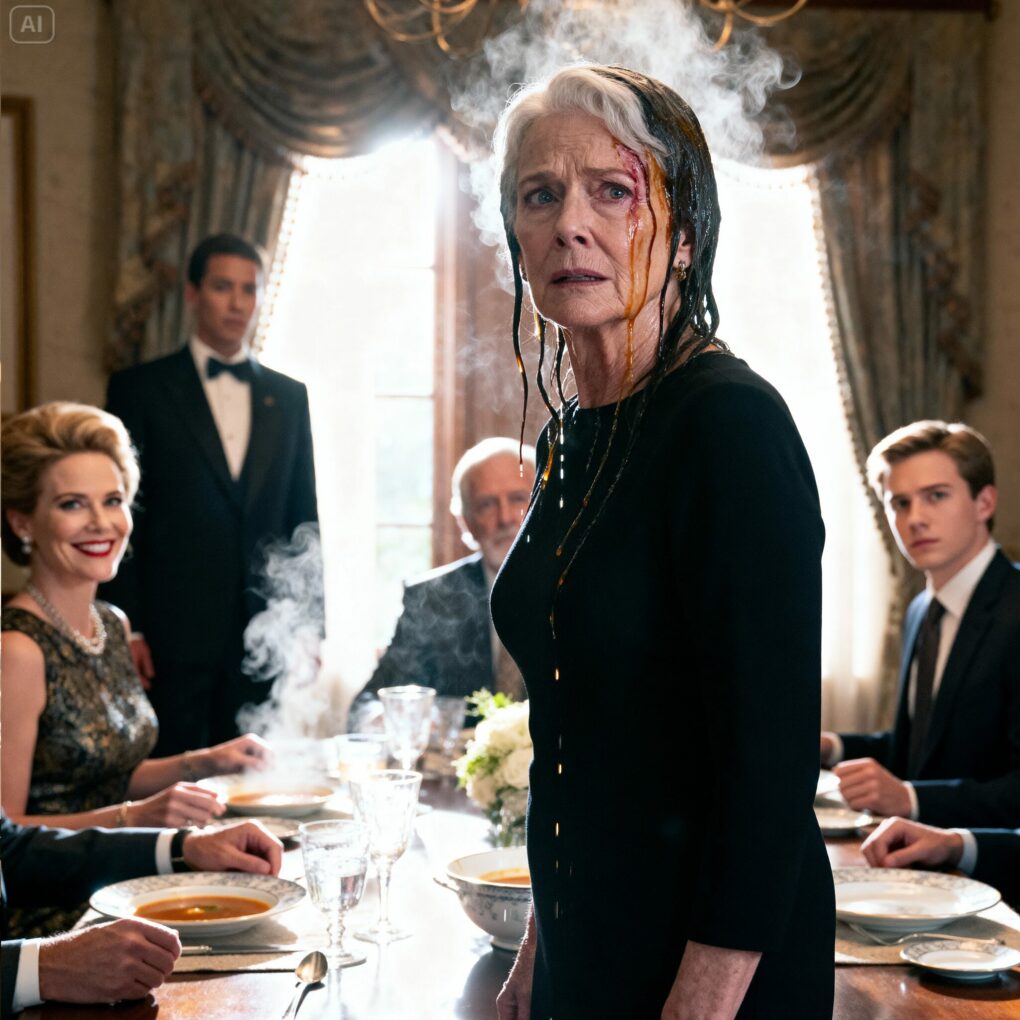 The heat exploded across my skin. I gasped as broth soaked my hair and collar, stinging my eyes. Laughter rippled—small, sharp, approving.