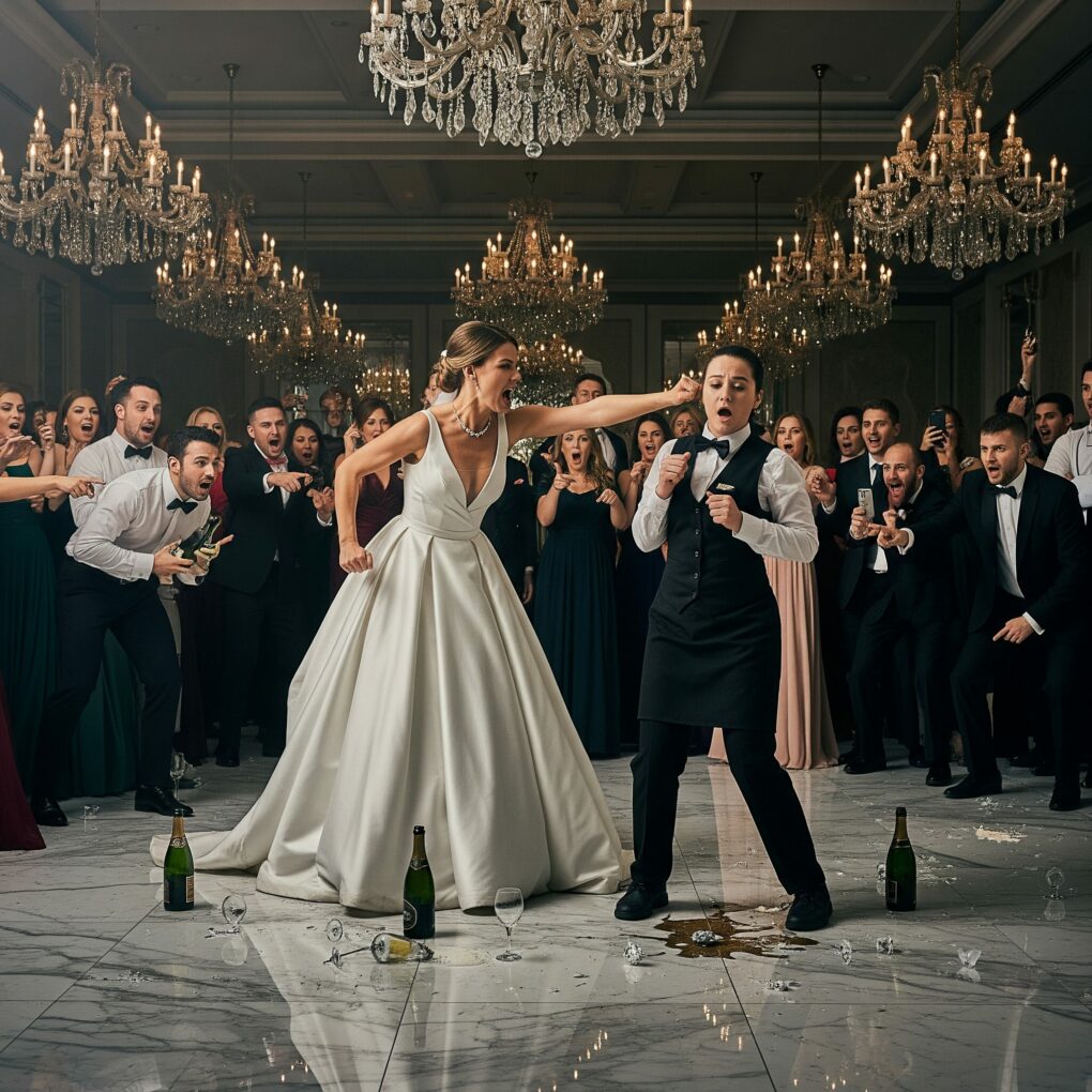 During the reception, I was serving champagne when a drunk guest stumbled into me. The tray flew. A few drops of champagne landed on the bride’s dress. Barely visible—but enough.