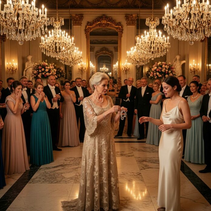 The champagne glass slipped from my fingers and shattered across the marble floor, the sound sharp enough to cut through the music. Laughter followed immediately. Not polite laughter—cruel, intentional laughter. Two hundred guests turned to look at me as my mother-in-law, Margaret Whitmore, smiled sweetly and pressed a small velvet box into my hand.