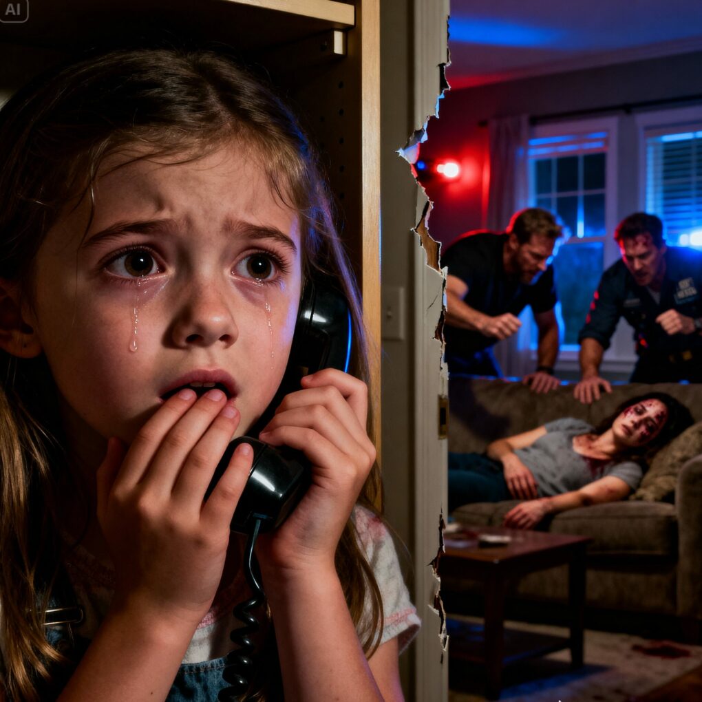 The dispatcher stayed calm, asking the child’s name and address. “Emily,” she answered, seven years old, hiding in her bedroom closet with the phone pressed to her chest. Down the hallway, she could hear glass breaking and her mother crying.