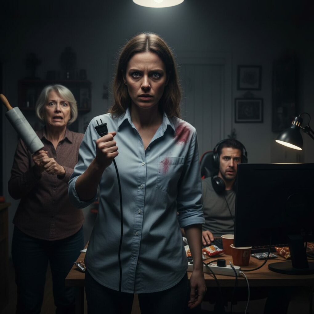 I gasped, the air leaving my lungs in a sharp wheeze, but Mark didn’t move. His character on the screen jumped over a wall, mirroring his own mental escape. Evelyn wasn’t finished. She struck again, this time hitting my upper arm. “That’ll teach you not to take out the trash! That’ll teach you to respect this house!” she hissed, her face contorted into a mask of pure, unadulterated malice. Each blow was a rhythmic punctuation of her long-standing hatred for me. I felt the skin break, a warm trickle of blood staining my sleeve, yet I remained eerily still. I didn’t scream for Mark; I knew he wouldn’t come. I simply waited, counting her breaths, watching her elderly muscles fatigue until the rolling pin slowed. My mind, usually a chaotic mess of anxiety, became terrifyingly clear. I realized then that the only way to hurt a man who ignores everything is to destroy the one thing he chooses to see. I didn’t run for the door. I didn’t grab a phone to call 911. Instead, I stood up, wiped the sweat and blood from my brow, and walked with a haunting, rhythmic calmness toward the glowing corner of the room where the heavy-duty power strip fueled Mark’s entire digital existence.