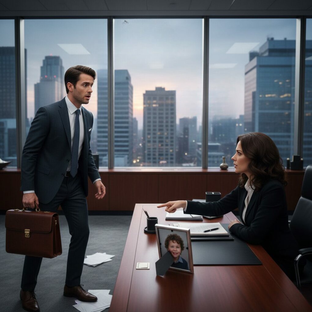 I stood up then, my heels clicking sharply on the floor as I rounded the desk to face him. “Rights? You talk about rights?” I hissed, my voice low but lethal. “You walked out because you were bored of the ‘domestic routine.’ You told me I was a weight around your neck. I didn’t steal anything; I protected him from a man who viewed family as a prison sentence.” Mark’s face went pale, then a deep, bruised red. He slumped back into the chair, burying his face in his hands. The high-powered executive was gone; in his place was a broken man realizing he had missed an entire lifetime in four years.