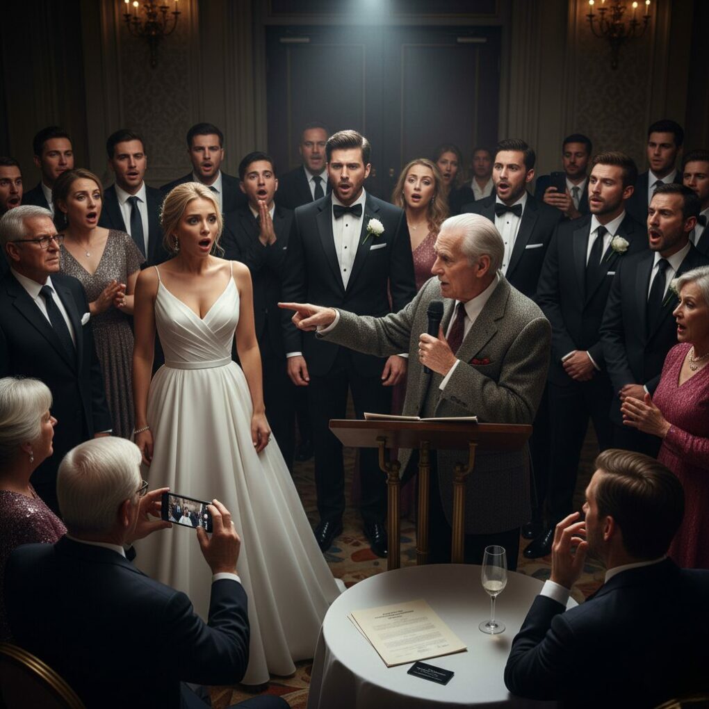 The tension peaked during the reception toasts. Julian stood up, holding a glass of vintage champagne. “I’d like to thank everyone for being here, except perhaps those who didn’t get the memo about the dress code,” he said, glancing mockingly at Arthur. The room erupted in snickers. Encouraged by the cruelty, Chloe’s new father-in-law added, “Maybe the gardener is looking for a tip?” That was the breaking point. Arthur stood up, his chair scraping loudly against the marble floor. He didn’t look hurt; he looked determined. He walked straight to the podium, ignoring the security guards who tried to intercept him. He grabbed the microphone, and the feedback hummed like a warning. “I’ve spent eighty years building a legacy based on integrity,” Arthur began, his voice booming with a power that silenced the room. “And in eighty seconds, I’m going to watch yours crumble.