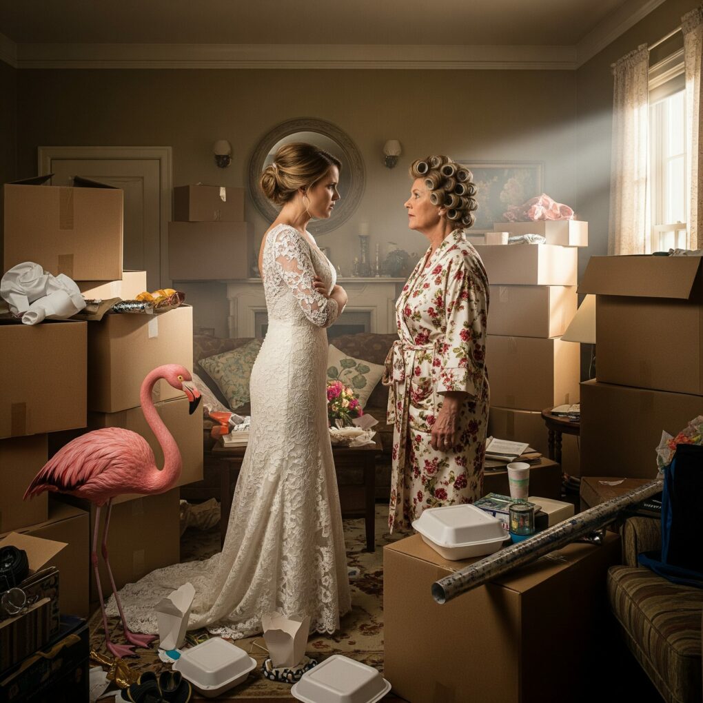 Before I could ask a question, she pushed past me carrying a battered cardboard box labeled kitchen stuff. She dropped it onto the floor beside the wedding favors with a heavy thud. Then she went back outside. And then again. And again.