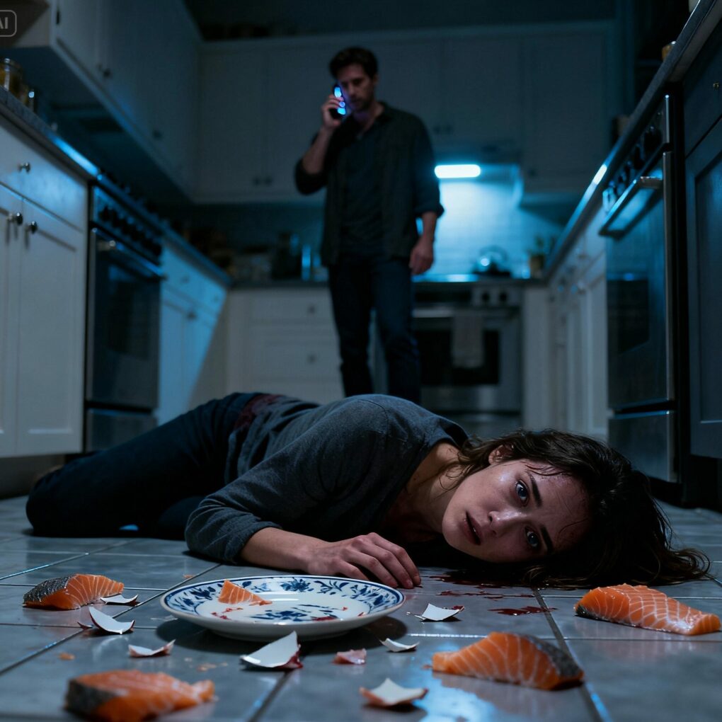 My heart pounded violently as I lay motionless on the cold kitchen floor, my cheek pressed against tile still damp from spilled water. The ceramic plate Alex had made for dinner lay shattered beside me, pieces of salmon scattered like evidence of a crime scene. Every instinct screamed at me to move, to gasp, to open my eyes—but I forced myself to stay still. This moment mattered too much.