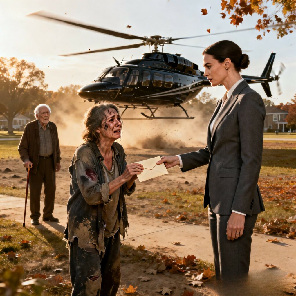 Suddenly, the air began to vibrate. A rhythmic thud-thud-thud echoed from above, growing louder until the wind from the rotors whipped the tablecloths into the air. A sleek, matte-black private helicopter descended toward the clearing adjacent to the park. The crowd gasped, shielding their eyes from the dust. As the engine whined down, the door opened. Lily stepped out, dressed in a custom-tailored suit, radiating an aura of power and wealth that silenced every person in that park. She walked toward us, her heels clicking on the pavement, straight toward the sister who had once spat on me.