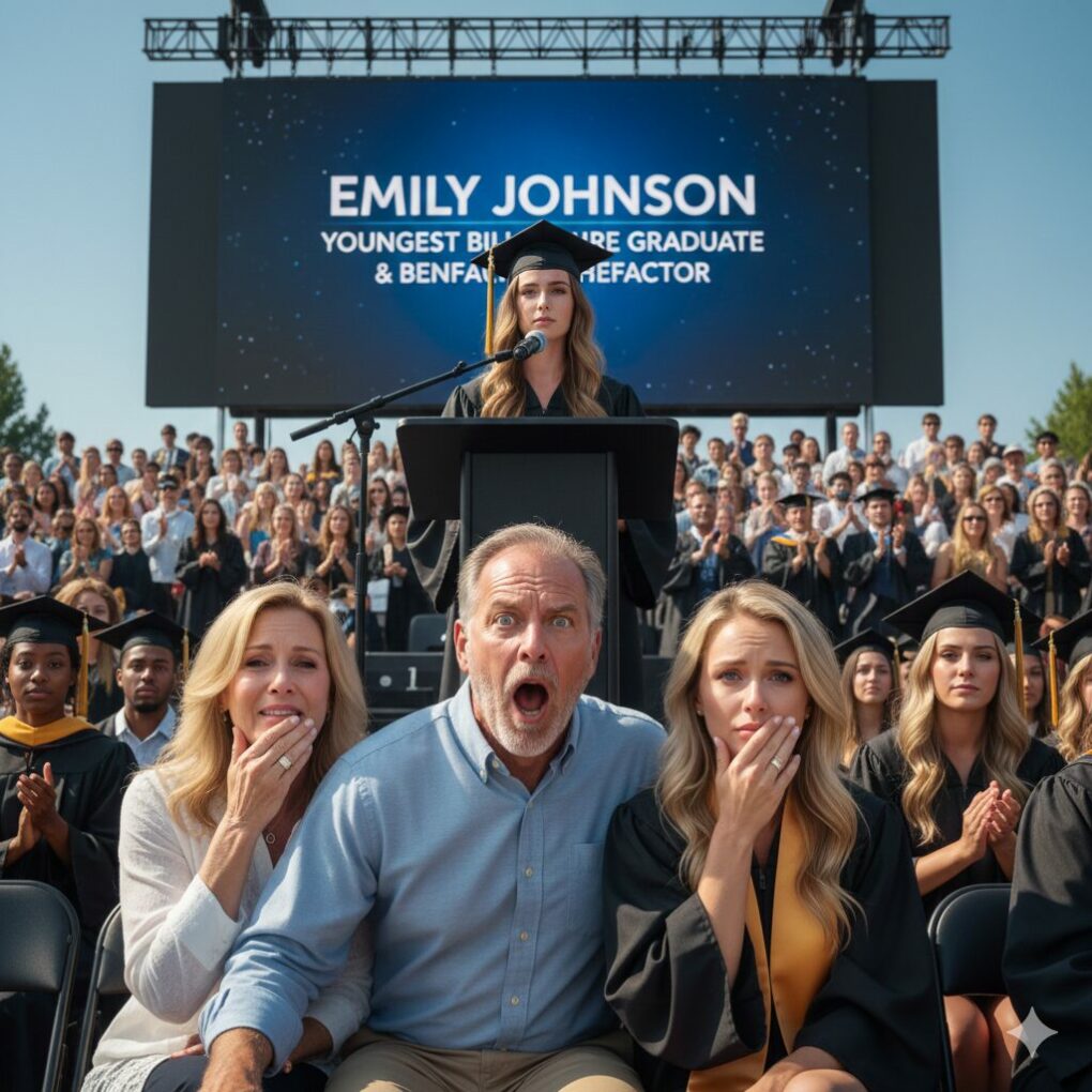 The morning of graduation arrived. My parents arrived in Chloe’s brand-new white Mercedes, barely acknowledging me in my plain black robe. They spent the hour before the ceremony taking selfies with Chloe, bragging to other parents about her “potential.” They didn’t even ask where I was sitting. As the ceremony began, the atmosphere shifted. The Dean took the podium, his voice echoing through the stadium with an unusual gravitas. “Before we confer the degrees, we have a special announcement. This university has received its largest endowment in history—a fifty-million-dollar gift to the technology department from an anonymous alumna who is graduating today.” My father scoffed, leaning toward my mother. “Must be some rich brat with a trust fund,” he whispered loudly. Then, the Dean looked directly toward my section. “And now, please welcome our youngest billionaire graduate and our benefactor… Emily Johnson.”