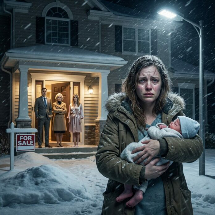 Snow fell hard, thick and merciless, coating the front yard of the house I once believed was my home. I stood barefoot on the frozen porch, clutching my newborn against my chest, her tiny body trembling through layers of blankets. My husband, Ethan, didn’t look at us. He stood beside his mother, Margaret, her lips pressed into a thin, satisfied line.