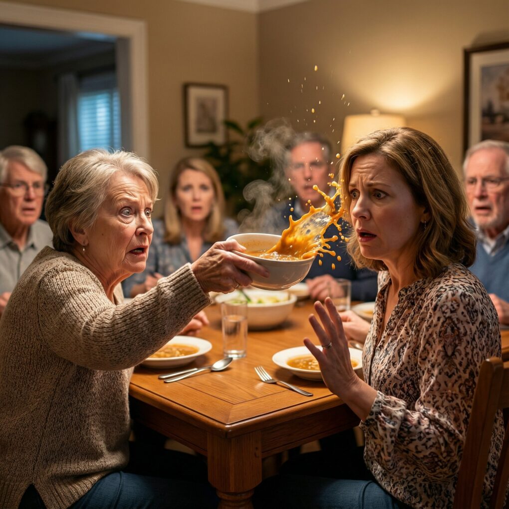The smell of roasted chicken still hung in the air when my son’s mother-in-law, Margaret Collins, suddenly stood up. One second, she was smiling politely across the table. The next, she grabbed the ceramic bowl of soup in front of her and hurled it straight at my face.