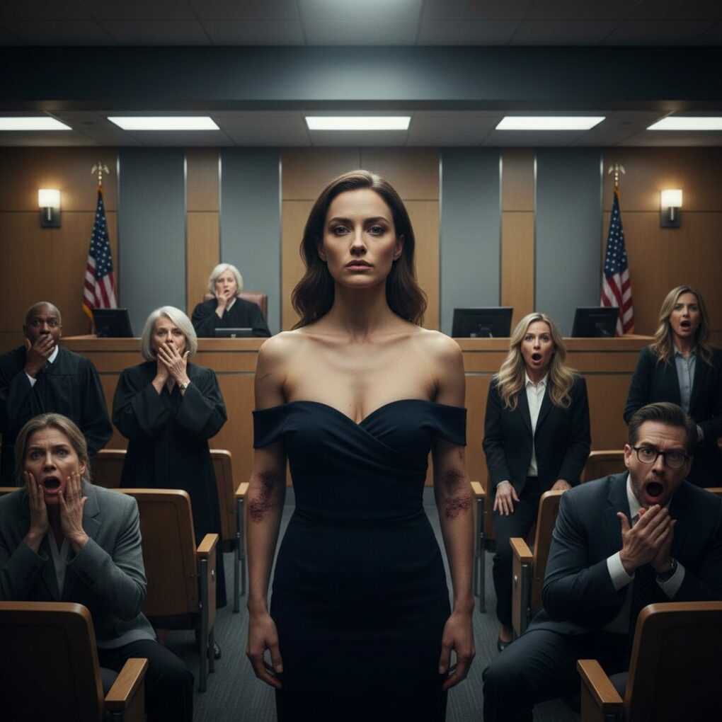 I unfastened the zipper of my dress. Gasps rippled through the courtroom—not because of skin, but because no one expected defiance. Beneath the dress was a simple tank top, and along my arms and shoulders were old, documented bruises and surgical scars from injuries he claimed never happened. The room went dead silent.