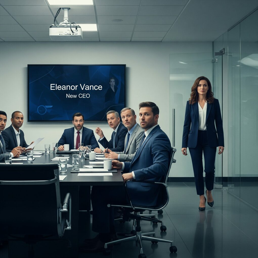 They climbed the stairwell, bypassing the elevator deadlock. Fifth-floor strategy suite. Voices murmured inside. Karen reached the door, glanced at Ryan, then pushed open a room frozen in disbelief. Seven board members, one glass table, her title glowing on the screen.