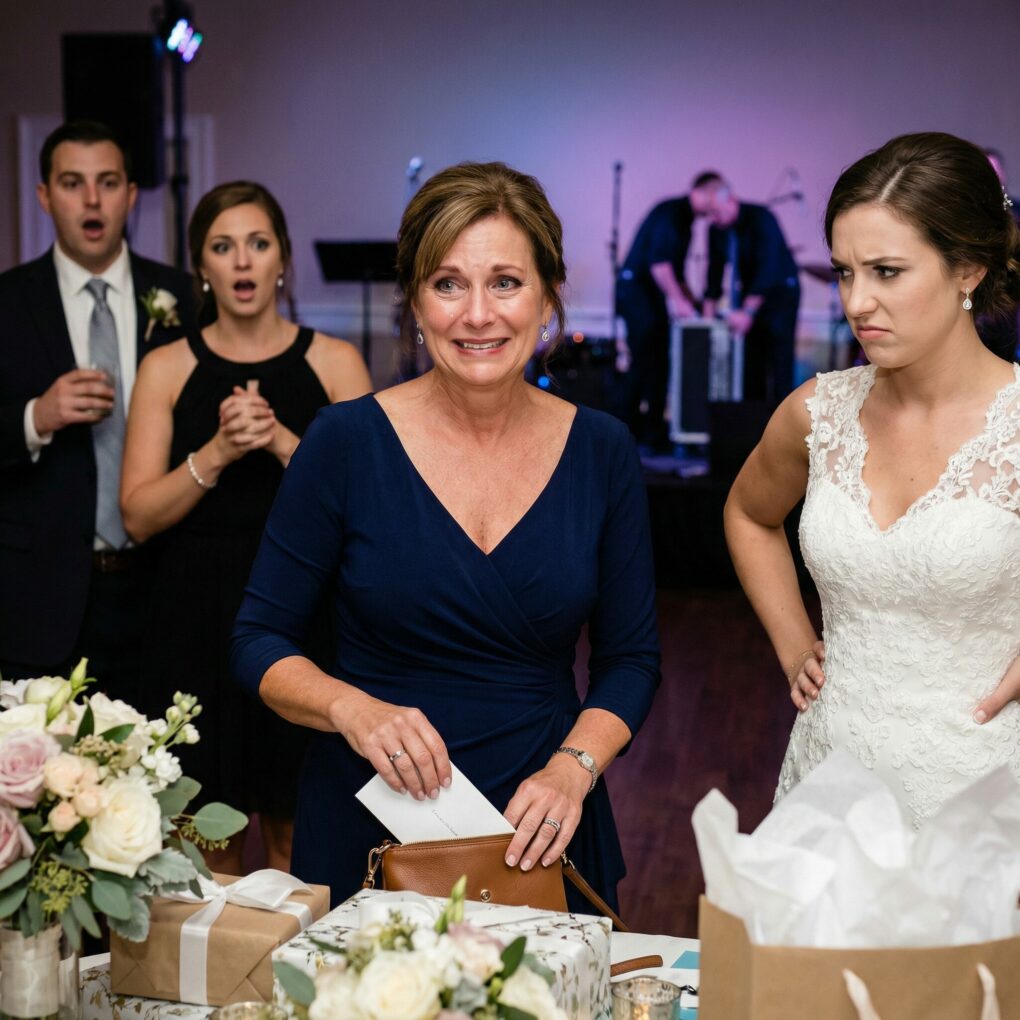 I felt something in me harden. My cheeks burned, but I didn’t cry. Instead, I smiled—a small, tight, controlled smile. I walked calmly to the gift table, past the stack of wrapped boxes and glittery envelopes. Under a silver card box, I saw the envelope with my handwriting.