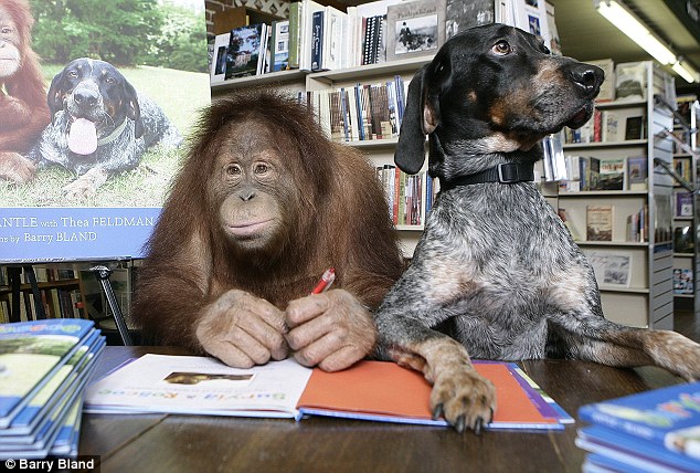 Best of friends: Suryia the Orangutan and Roscoe the dog at their book signing