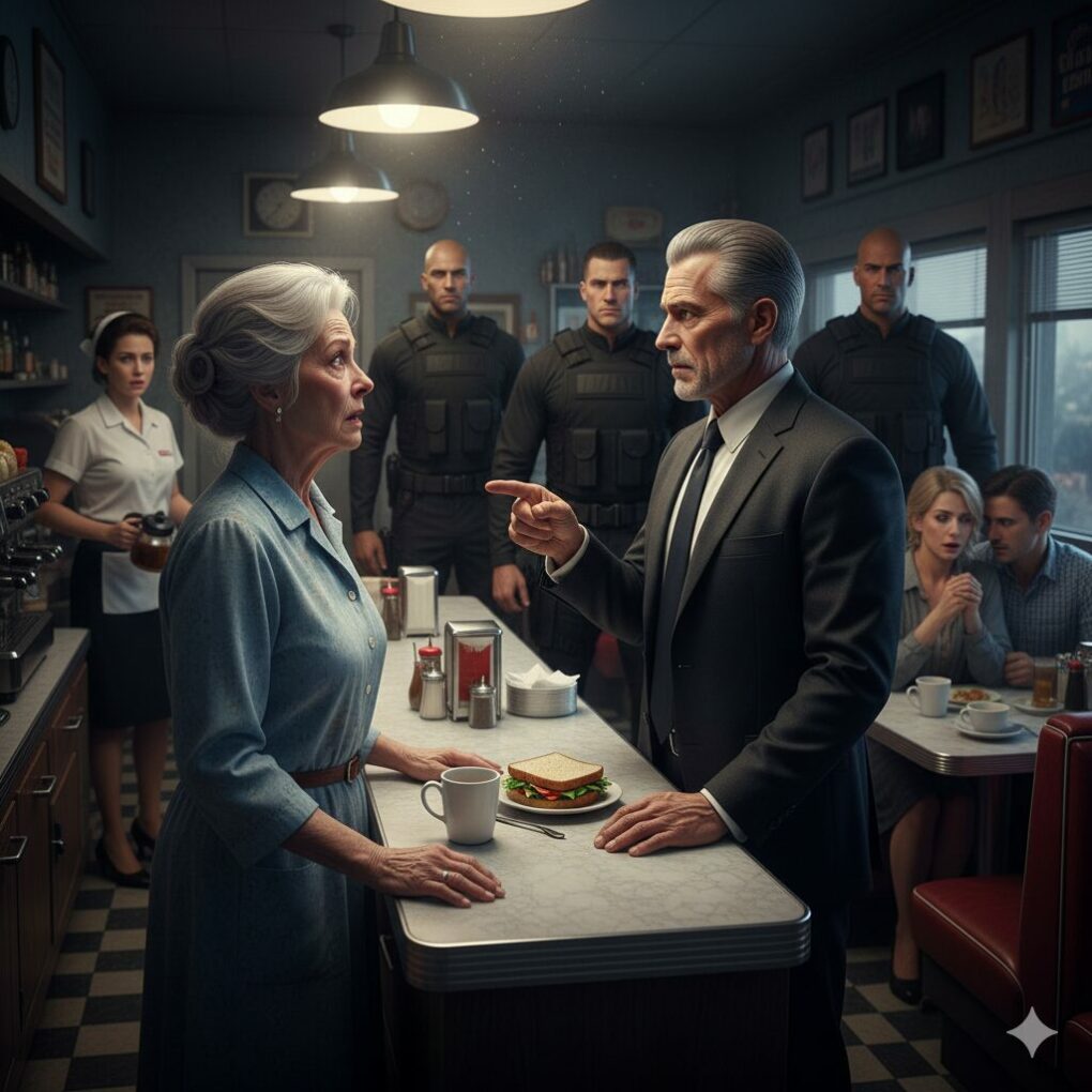 The diner’s atmosphere shifted from tense to terrifying as four hulking men in charcoal tactical suits burst through the entrance. They didn’t look like criminals; they moved with the synchronized precision of elite private security. David jumped back, his arrogance instantly replaced by a pale mask of fear. “What is this? Is this a robbery?” he stammered, raising his hands. The bodyguards ignored him entirely, forming a protective perimeter around the corner booth. To Martha’s utter shock, Arthur—the man she thought was a homeless vagrant—stood up. His trembling had vanished, replaced by a spine-straight posture and an air of immense authority.