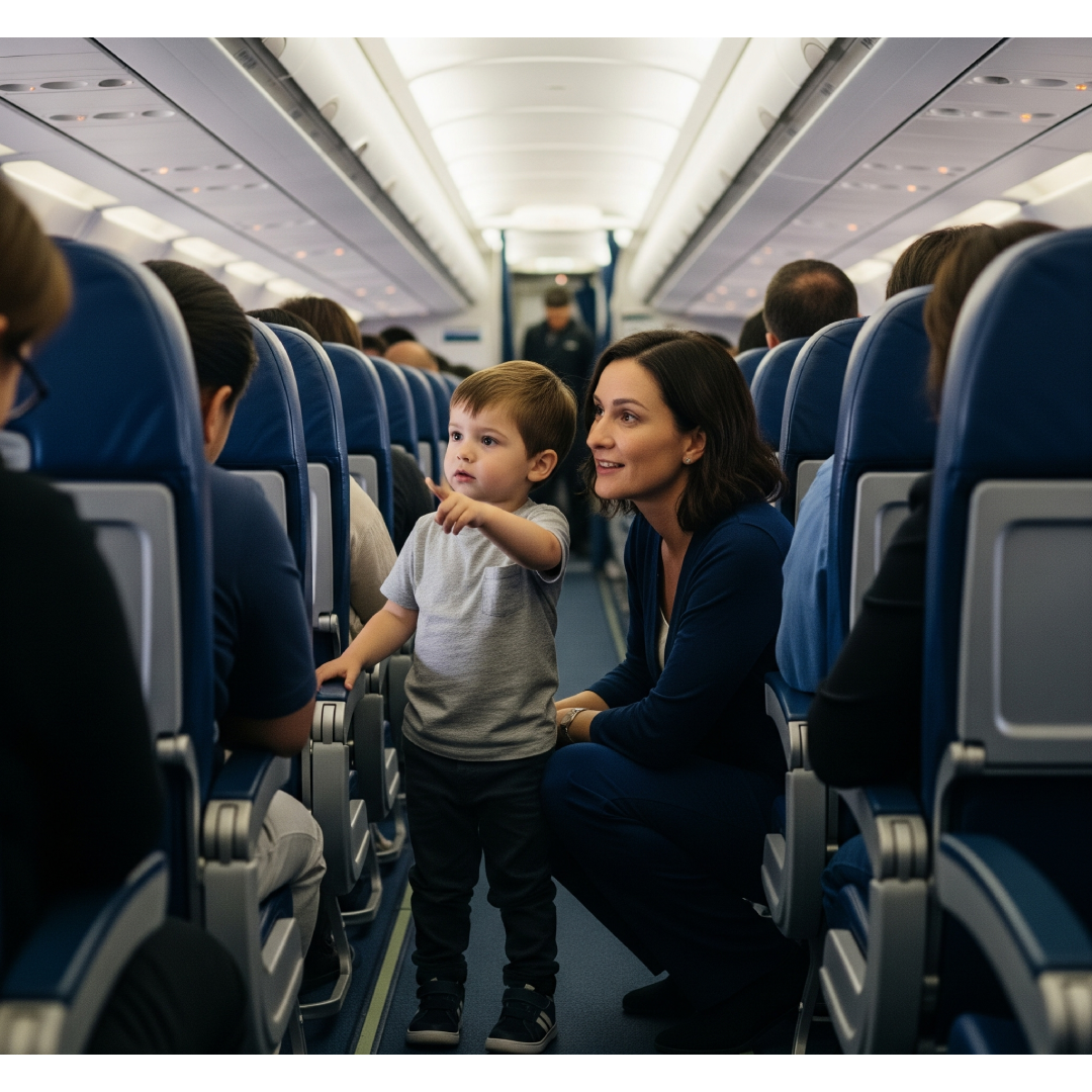 The plane was stuffy. A toddler cried somewhere in the back. As Emma helped Noah settle into his seat by the window, he suddenly tugged on her sleeve.