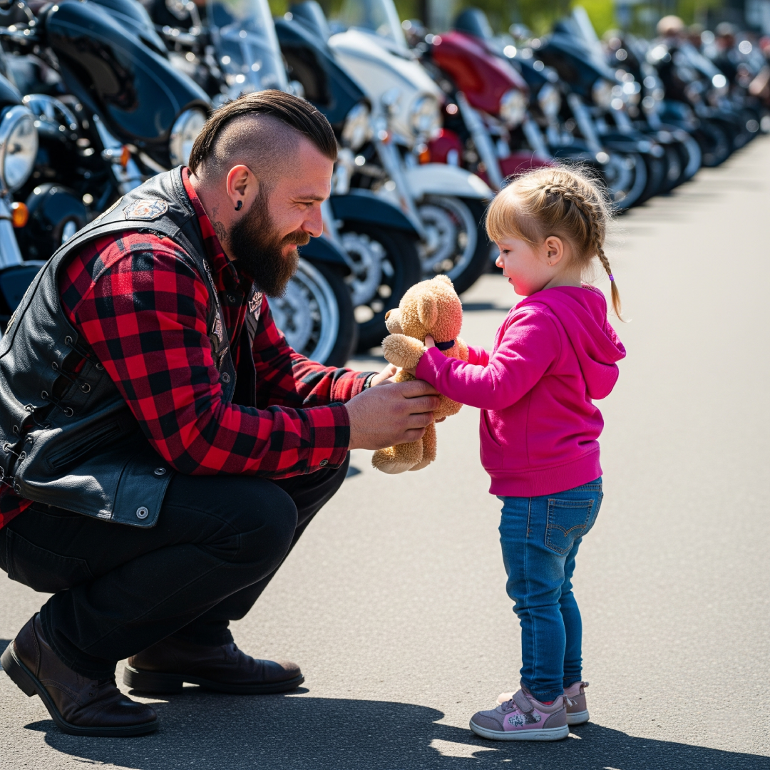 It happened on a warm Sunday afternoon, during the town’s annual motorcycle rally. The streets echoed with the low growls of engines, leather jackets shimmered in the sun, and chrome glinted from every direction. Among the sea of bikers and machines, my daughter—just four years old and clutching her worn teddy bear—walked straight toward the biggest, meanest-looking man in the entire parking lot. What she said next didn’t just stop him in his tracks—it changed his life.