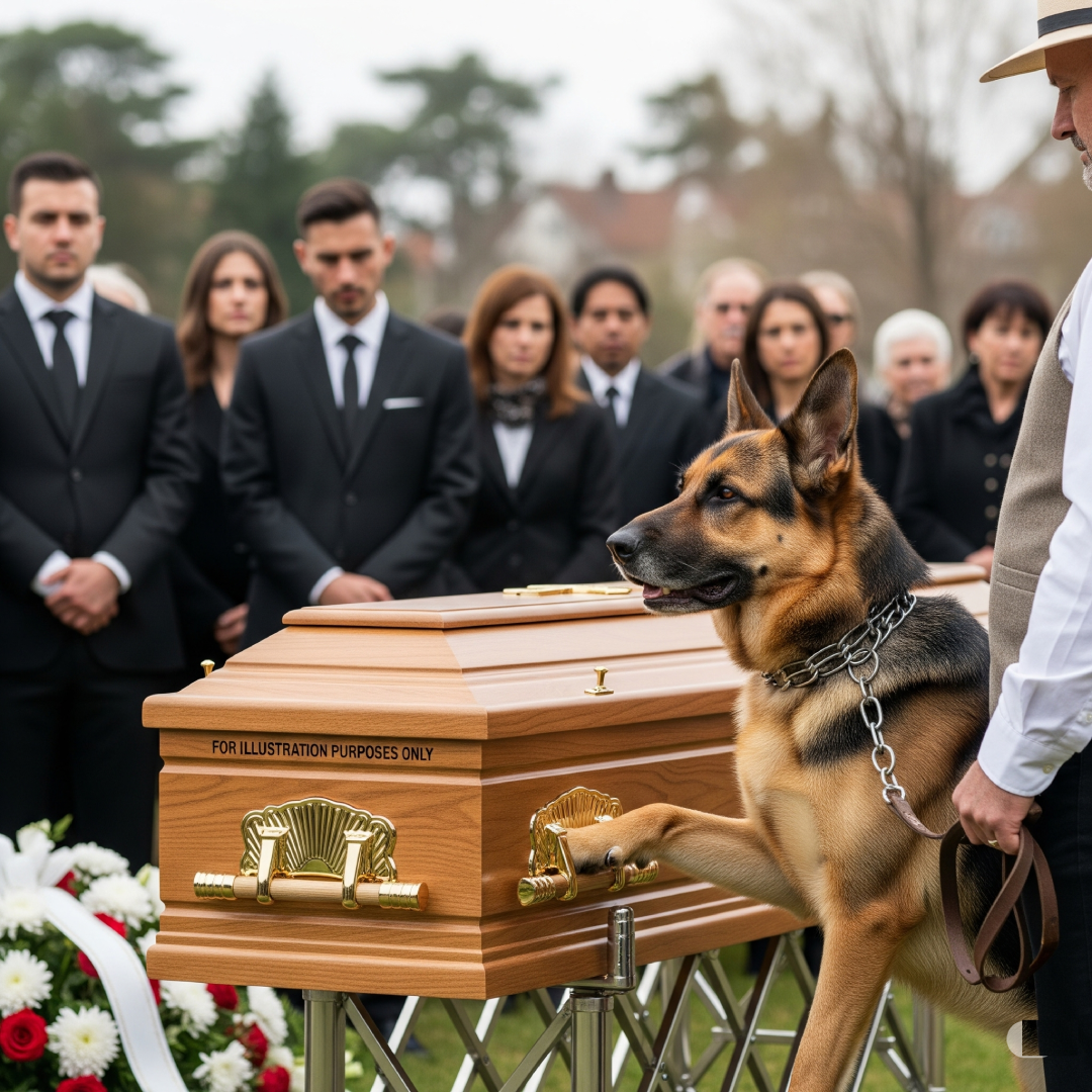 Ears perked, muscles taut, eyes locked on the polished mahogany box like it had spoken. Then, with a sudden sharp movement, he lunged—paw slamming against the side of the casket, letting out a low, guttural growl that startled even the most hardened officers in the front row.