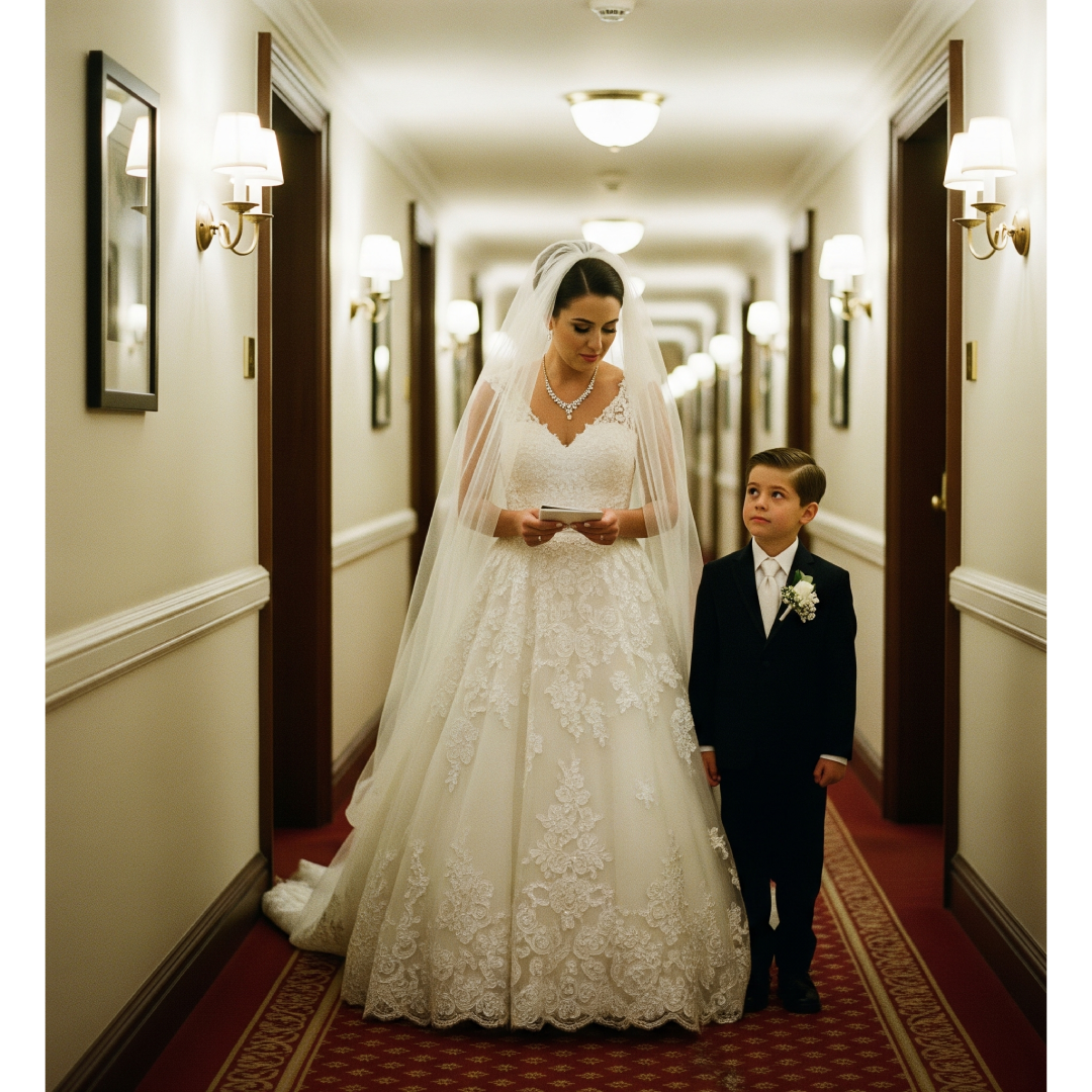 I stood in the hallway, bouquet in hand, veil brushed gently over my shoulders, while Liam looked up at me like I was his only hope of stopping something inevitable.