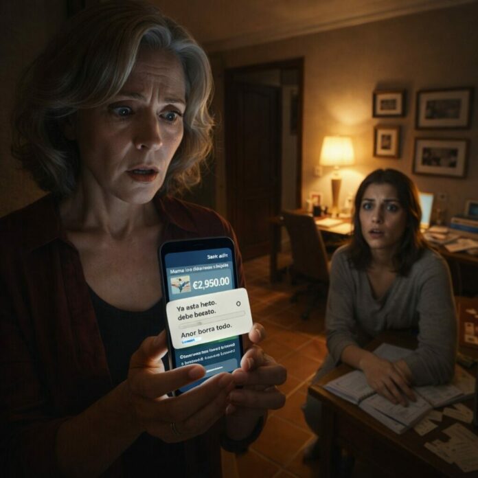 Entonces entró una notificación del banco, con el logo bien claro. “Transferencia realizada”. Debajo, una cifra que me dejó sin aire: 2.950 euros. “Cuenta destino: desconocida”. Se me helaron las manos. Me apoyé en la pared para no caer.