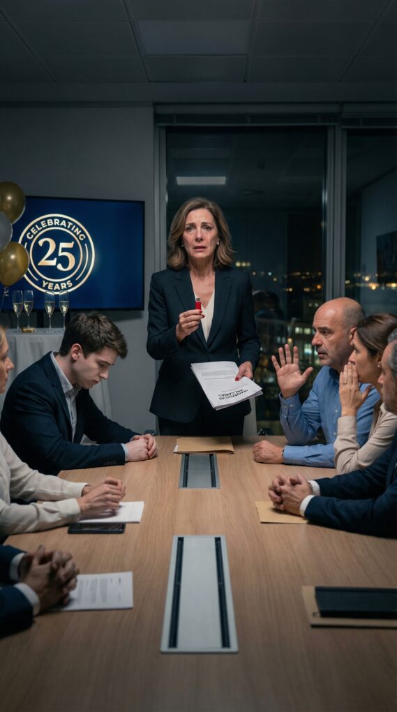 Subí igual. La sala de juntas estaba preparada para la fiesta que yo no debía ver: flores, una pantalla con el logo, copas alineadas. Y allí estaba mi hijo, impecable, rodeado de su nuevo “círculo”: el CFO Diego Valdés, la jefa legal Irene Castaño y varios inversores tensos.