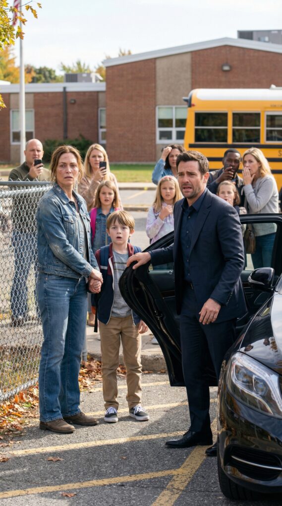 Then, on a crisp Thursday afternoon, I stood at the elementary school gate with Ethan’s backpack in my hand. Kids spilled out like marbles, yelling and shoving. That’s when a sleek black car glided up to the curb and stopped beside us—too polished for our cracked sidewalks. Ethan went still.