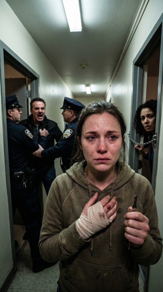 I didn’t answer. I sprinted for the stairwell, but my legs felt like wet sand. My neighbors’ doors flew past—silent, closed, indifferent. I banged on the nearest one with my good hand.