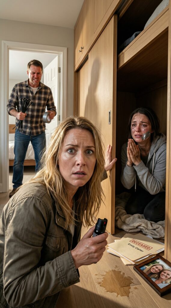 I sprayed blindly. A harsh chemical cloud hit his face, and he recoiled with a strangled sound, clawing at his eyes. That was our opening. I grabbed Rachel’s wrist and ran—bare feet slapping down the hallway, past the scuff marks, past the new lock, past years of “normal” that suddenly felt like a set.