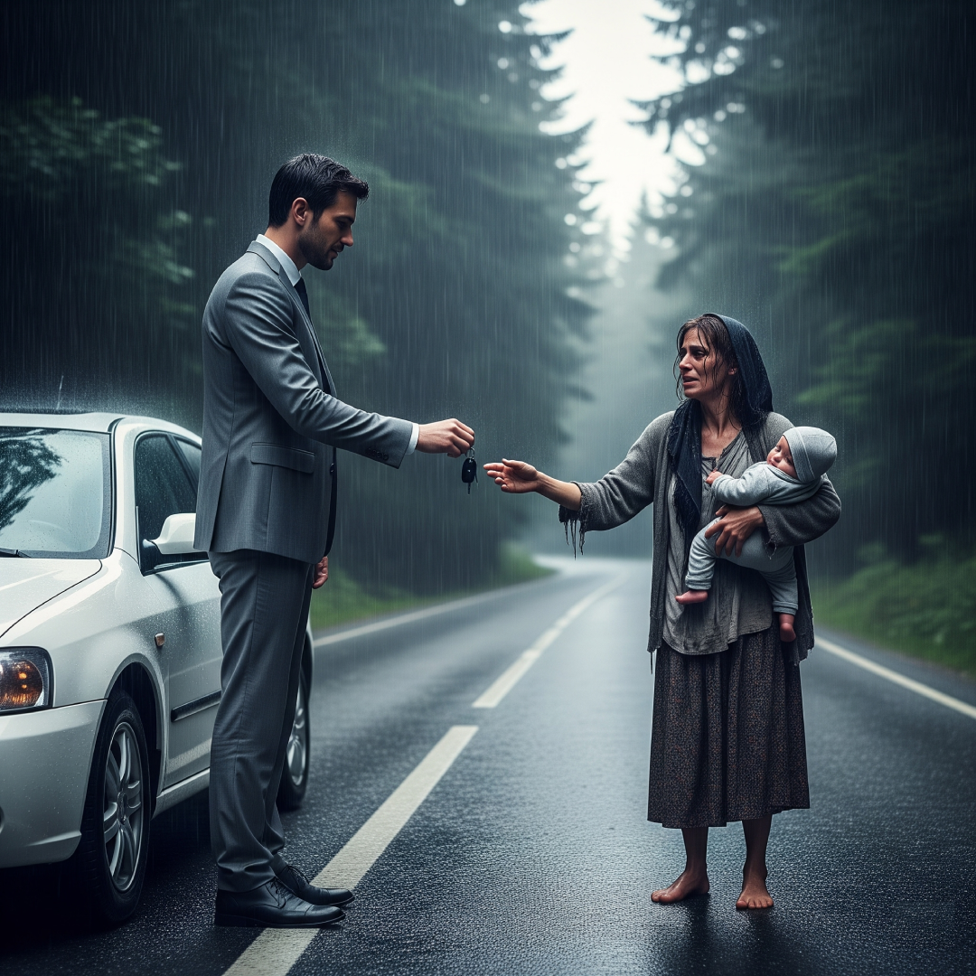 Before she could respond, he turned back to his car and drove away—leaving her speechless in the rain, holding the key to a mansion.
