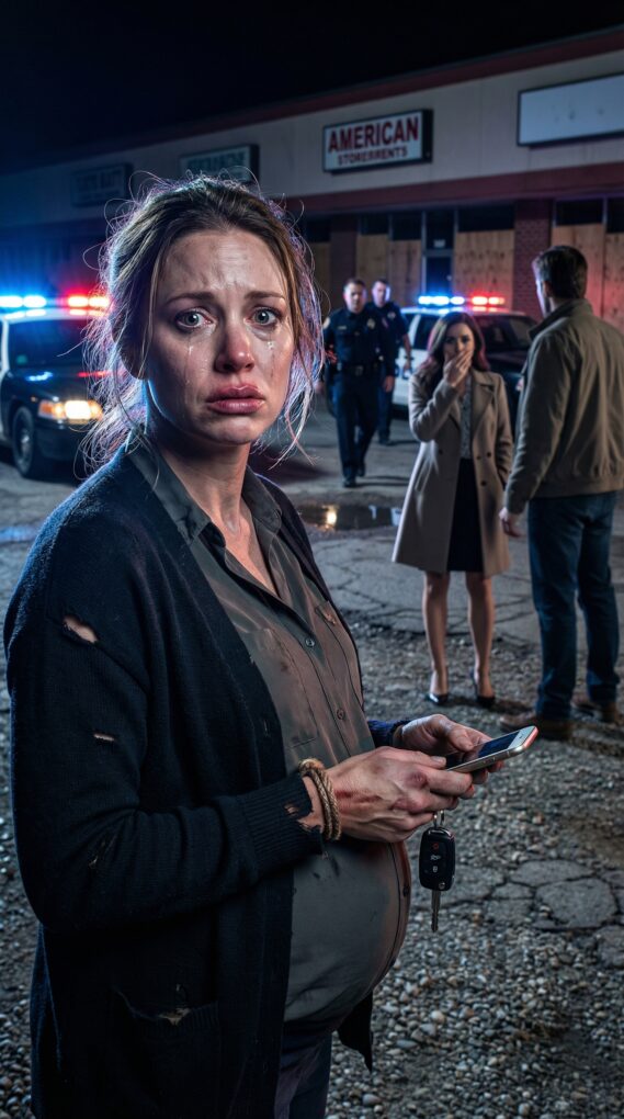 The door swings open a few inches and cold night air hits my face like water. I don’t think—I crawl, then stumble, then run, barefoot on gravel behind the shops. My ribs scream with every step, and the baby’s movements feel frantic, but the parking lot lights are real, and so are the cars. Real means witnesses.