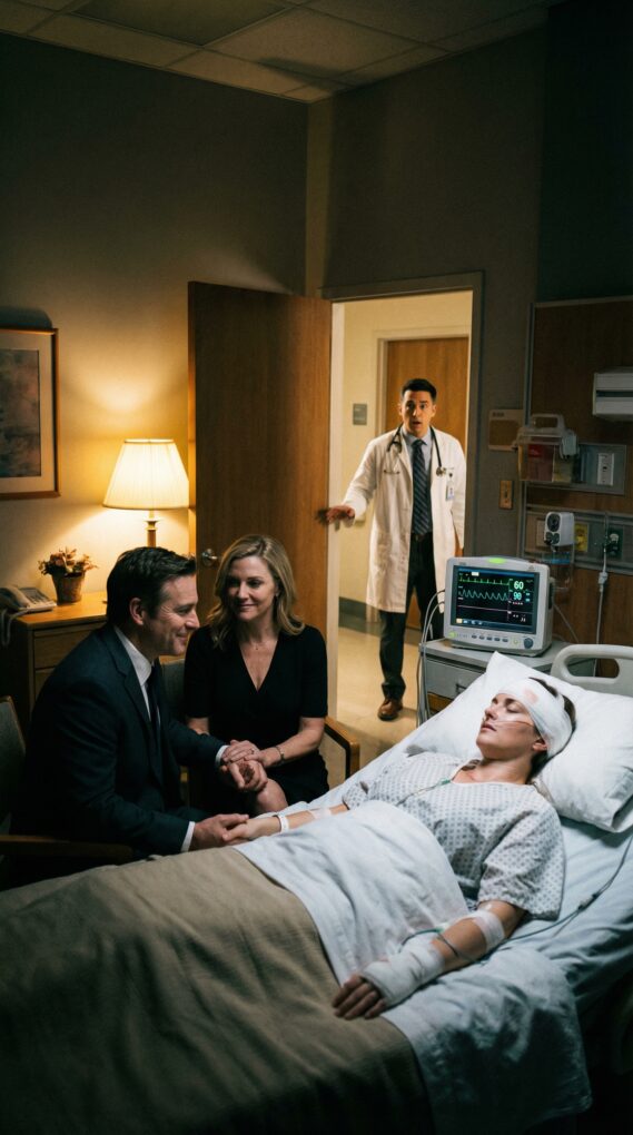Dr. Patel’s expression hardens. He looks to the foot of my bed where Ethan stands frozen, his black jacket still on, his fake grief evaporating. The woman beside him—perfect makeup, sharp heels—stares like she’s been caught stealing.