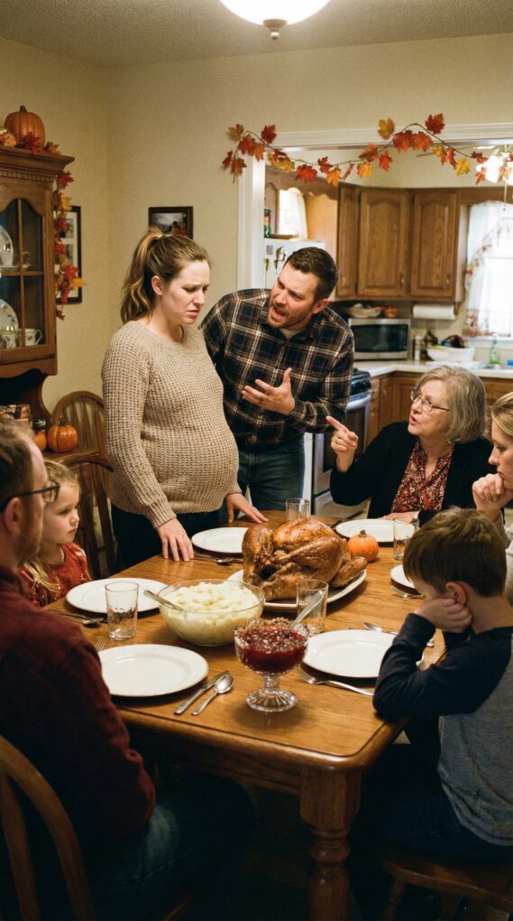 Thanksgiving was supposed to smell like cinnamon and peace—until my husband’s smile turned into a warning. “You’re not sitting,” he whispered, gripping my wrist so hard my fingers tingled. I was eight months pregnant, my back aching, my feet swollen inside shoes that hadn’t fit for weeks. But in his parents’ dining room, comfort was a privilege I apparently hadn’t earned.