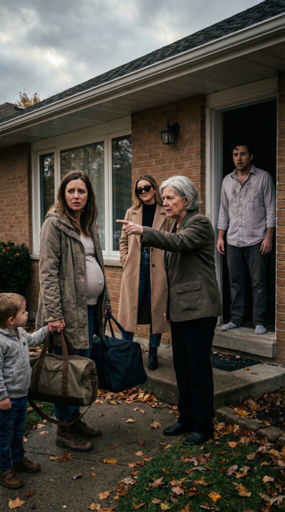 I stood on the porch with my swollen belly pressing against my coat, my other hand locked around my three-year-old son’s. “Tyler, stay close to Mommy,” I whispered. His little fingers shook in mine.