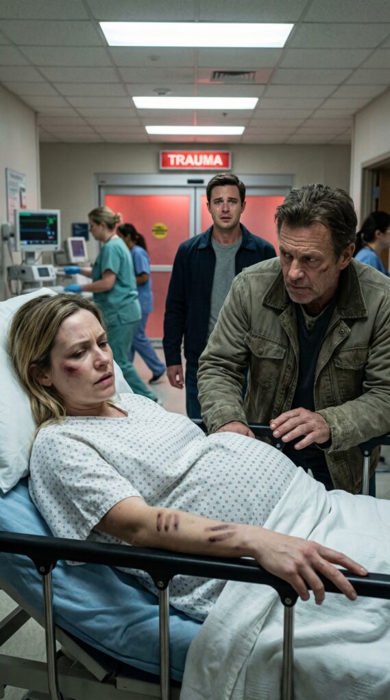 I followed the nurse, signing with a hand that wouldn’t stop shaking. Through a glass panel, I saw Emily—face pale, hair matted, belly impossibly round beneath torn hospital sheets. A doctor murmured to another, “Steering-wheel impact… but the bruising pattern’s off.”