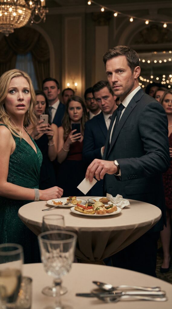 Madison’s eyes flick over me, not recognizing the face she used to ruin. She tilts her head, smirking, and picks up a plate from the buffet—one that’s already half-eaten. She walks right up and shoves it toward my hands.