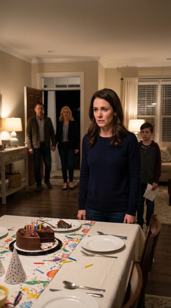 After I tucked him in, I returned to the dining room. The cake sat untouched, candles melted into small wax lakes. I scraped them off one by one, not because it mattered, but because I needed to do something that didn’t fall apart.
