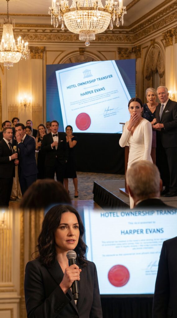 I walked into my brother Ethan’s engagement party at the Grand Meridian Hotel and immediately felt the shift in the room. It wasn’t subtle. It was the kind of silence that carries judgment. I had driven in from our hometown that morning, still wearing the boots I preferred over heels. As I stepped further inside the ballroom, I heard her. Olivia Carter—Ethan’s fiancée—leaned toward her bridesmaids and whispered just loud enough, “The stinky country girl is here.” A few of them laughed. I stopped walking but didn’t turn around. I had heard worse growing up in a farming town. What Olivia didn’t know was that I wasn’t just a guest. I owned the hotel. Three years earlier, after selling the agricultural logistics company I built from scratch, I invested in commercial real estate. The Grand Meridian was my largest acquisition. I rarely attended events personally, preferring to stay behind the scenes. Tonight, I had planned to surprise Ethan after finalizing renovations. Instead, I stood there listening to his future wife mock my background. I turned slowly, meeting Olivia’s eyes. She looked polished, elegant, confident. “Welcome,” she said sweetly, masking the insult. I smiled politely. “Beautiful venue,” I replied. “You must be proud.” She lifted her chin. “My family insisted on the best.” I glanced around the room—the crystal chandeliers, the custom floral arrangements I personally approved. “Yes,” I said calmly. “They did.” Throughout the evening, Olivia continued making subtle comments about my accent, my upbringing, and how “impressive” it was that I’d “made something of myself.” I didn’t correct her. Not yet. Ethan looked uncomfortable but said nothing. That part hurt more than the insult. As dinner was about to be served, Olivia tapped her glass for attention. “Before we continue,” she announced brightly, “I just want to thank my parents for securing this incredible hotel.” She raised her champagne glass dramatically. That was my cue. I walked calmly toward the stage and leaned toward the event coordinator. “It’s time,” I said quietly. Moments later, the large digital screen behind Olivia flickered on. And that’s when the room went completely silent.