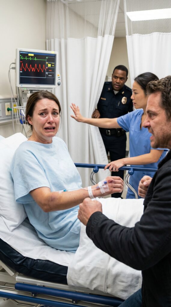 Everything became motion and voices. Two nurses pried Mark’s hands away while a security officer wedged himself between us. Mark shouted about “my wife” and “my bills,” but the officer pinned him against the wall and ordered him to calm down. The curtain shook as more staff crowded in.